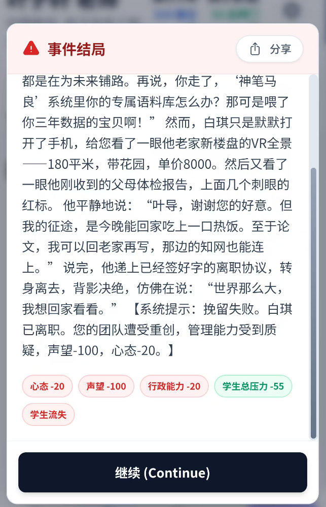 8. 遇到想离职的青椒,必须果断画大饼挽留。即便失败会叠加DeBuff,放任离开同样不会换来感激,照样触发负面效果。