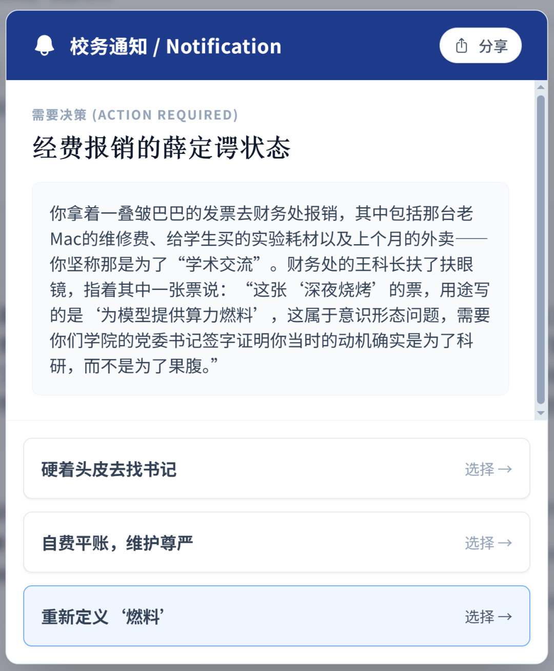 7. 经费报销堪称终极考验,如何说服财务处老师盖章,最能体现你的沟通与应变能力。