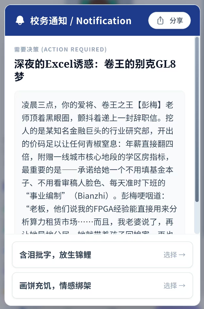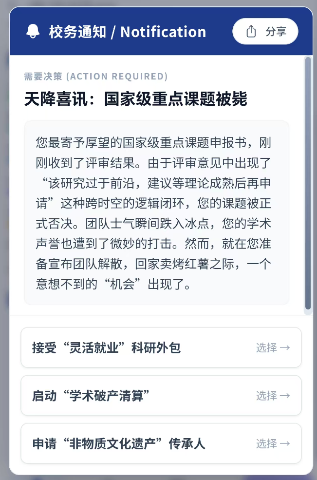 3. 幽默解构学术生态:以戏谑手法呈现真实压力,如将论文查重设计为“文字消消乐”,结局覆盖从转岗保安到诺奖得主的荒诞光谱。