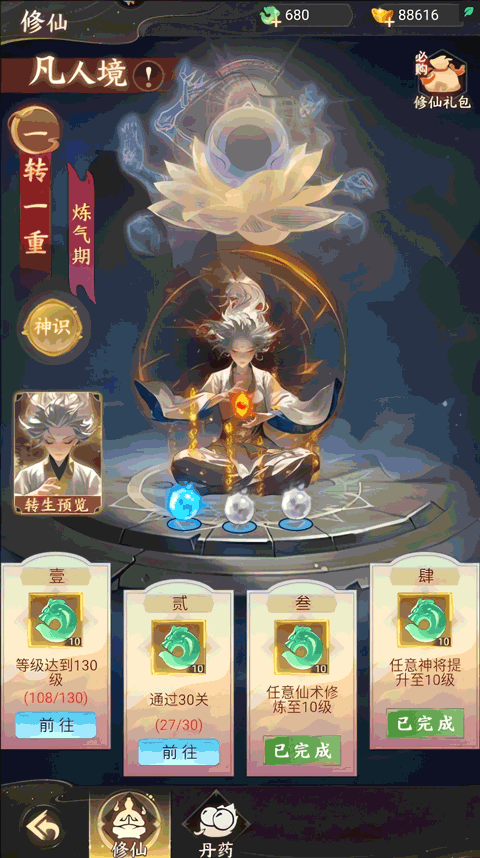 在修仙界面完成角色升级任务,即可获得阶段性仙玉回馈。