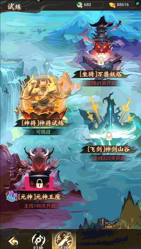 将获得的神将编入阵容,通过升星、装备神器、激活御魂等方式全面提升战斗力。
