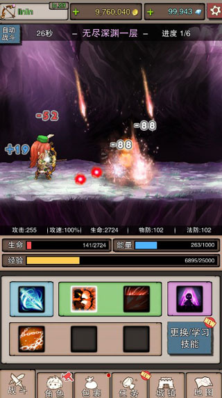 战斗界面说明:界面顶部显示金币与钻石;中部为战斗区域;底部展示攻击、攻速、闪避与暴击数值。生命值归零即角色死亡,需重新开始关卡(通关后自动回满)。能量值用于释放次要与战术技能,可通过时间自然恢复或特定装备击杀回能。经验值达标即可升级,而技能的合理释放与搭配,是成为顶尖冒险者的基本素养。