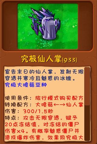 核心能力:发射无限穿透的冰锥,每1.5秒造成300点伤害并赋予20点冻结值;对已冻结目标伤害提升至4倍,并有概率魅惑僵尸并引发爆炸伤害。