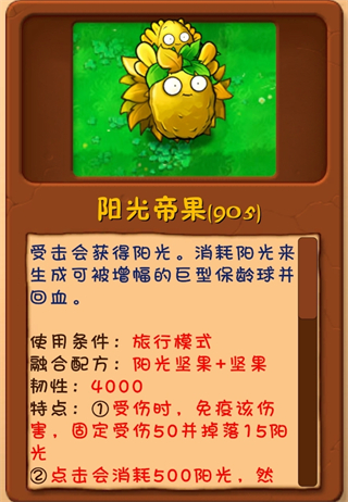 核心能力:拥有4000点韧性,受伤时免疫本次伤害并固定掉血50、掉落15阳光;点击消耗500阳光可生成巨型保龄球并恢复自身血量,集防御、产阳光与控场于一体。