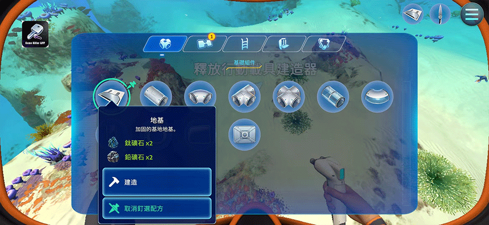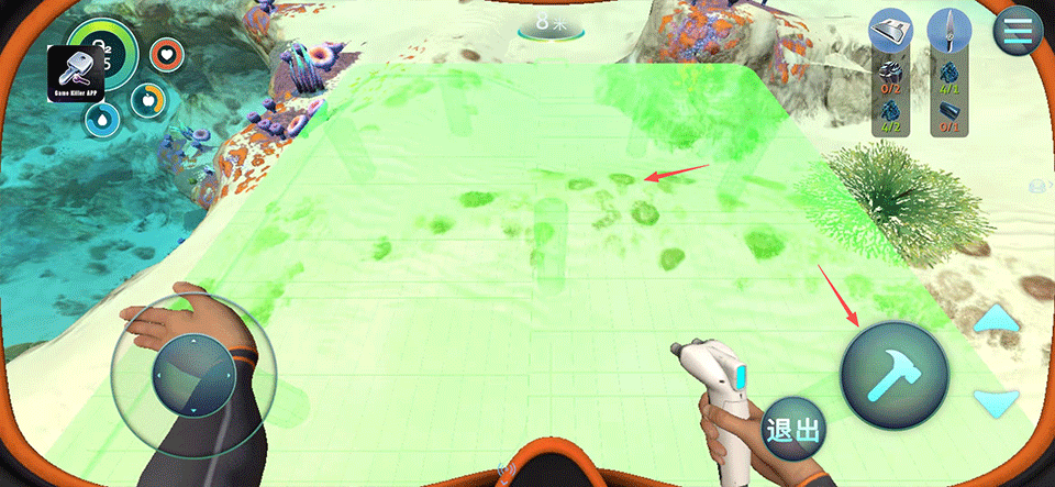 6、将地基拖动至海底开阔区域,点击锤子图标确认放置,即可开始自由搭建个性化海底基地。