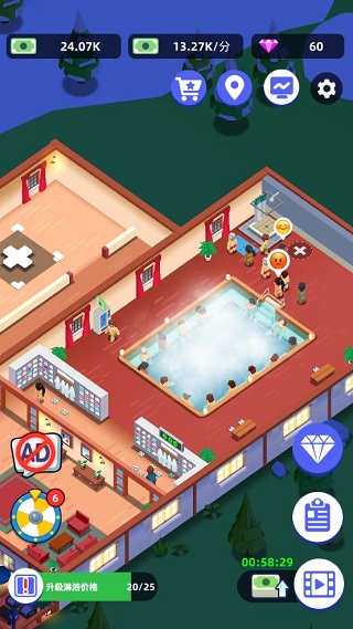 游戏初期从基础温泉起步,随着收入增长,逐步引入泡澡、淋浴、搓背、按摩等多元化服务项目。前台收银效率直接影响现金流速度,务必优先优化。通过策划限时推广活动,可有效吸引新客源;同时,扩建更衣柜是提升客容量的关键步骤,切勿忽视。为避免顾客流失,需合理调配各服务区域的人流,确保等候时间在合理范围内。此外,你还可以通过加薪激励员工,提升整体服务效率。每一次投资决策都将影响温泉的发展方向——是专注高端定制服务,还是走大众亲民路线?由你定夺。