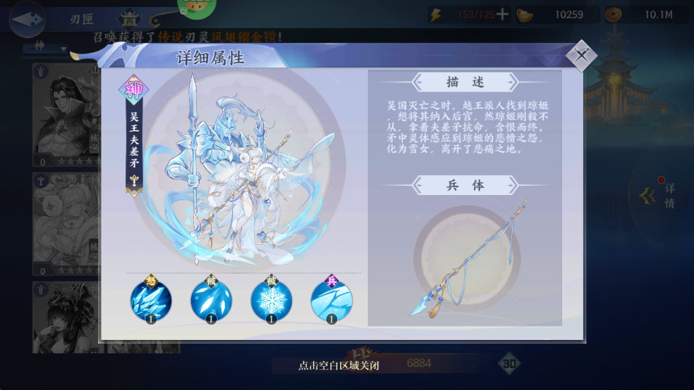 吴国覆灭之际,琼姬持此矛拒辱自尽。矛中灵体感其悲愤怨念,化身为雪女,带着不屈之志离开故土,清冷孤傲,却心藏烈焰。