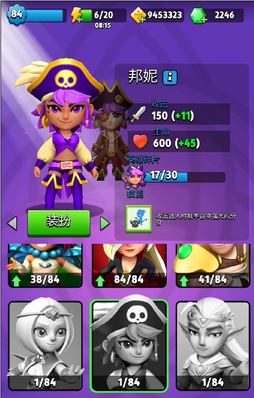 邦妮是游戏中综合实力顶尖的英雄之一,无论PVE还是PVP场景均表现强势。作为最高稀有度角色,其获取成本较高(海外售价10美元,需大量碎片兑换)。基础属性为150攻击力与600生命值,虽属中游水平,但其核心技能极具战略价值。