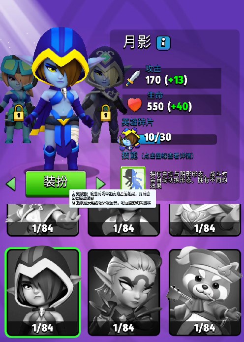 月影是当前版本纯氪金限定角色,活动几乎不产出其碎片,培养门槛极高。但其170攻击力(550生命值)的暗影系面板,配合独特的双形态技能,使其成为单体输出天花板。