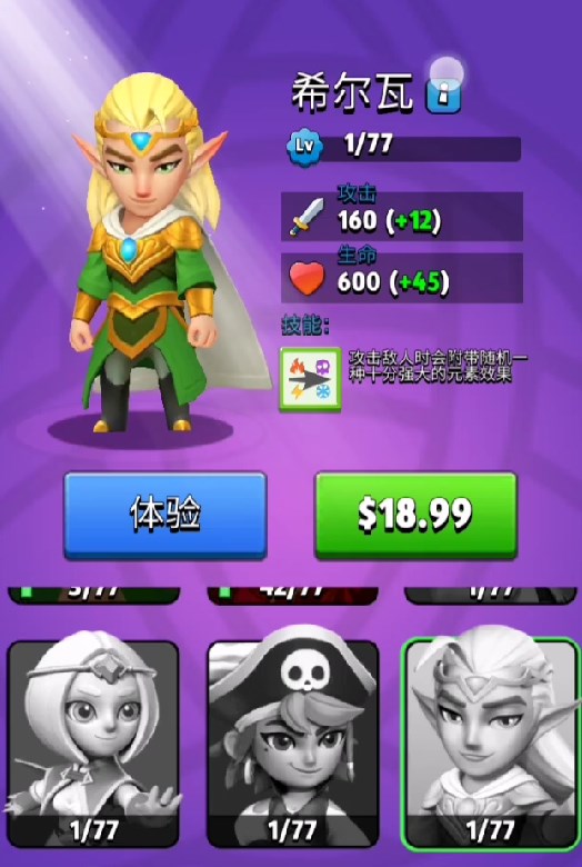 作为精灵王子,希尔瓦是游戏中稀有度与强度双顶级的存在,获取难度约为邦妮的两倍。其基础面板高达160攻击力与600生命值,稳居输出梯队前列。核心优势在于其技能可随机附加四大元素特效:火属性(持续燃烧)、冰属性(冻结控制)、雷属性(高频打击)及毒属性(侵蚀伤害)。