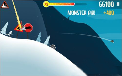 - 八倍加速机制:保持高斜度下坠姿势,可依次触发黄色、红色乃至蓝色火焰,实现最高三倍加速。火焰状态可抵消一次岩石撞击(但无法免疫垂直坠入雪堆)。