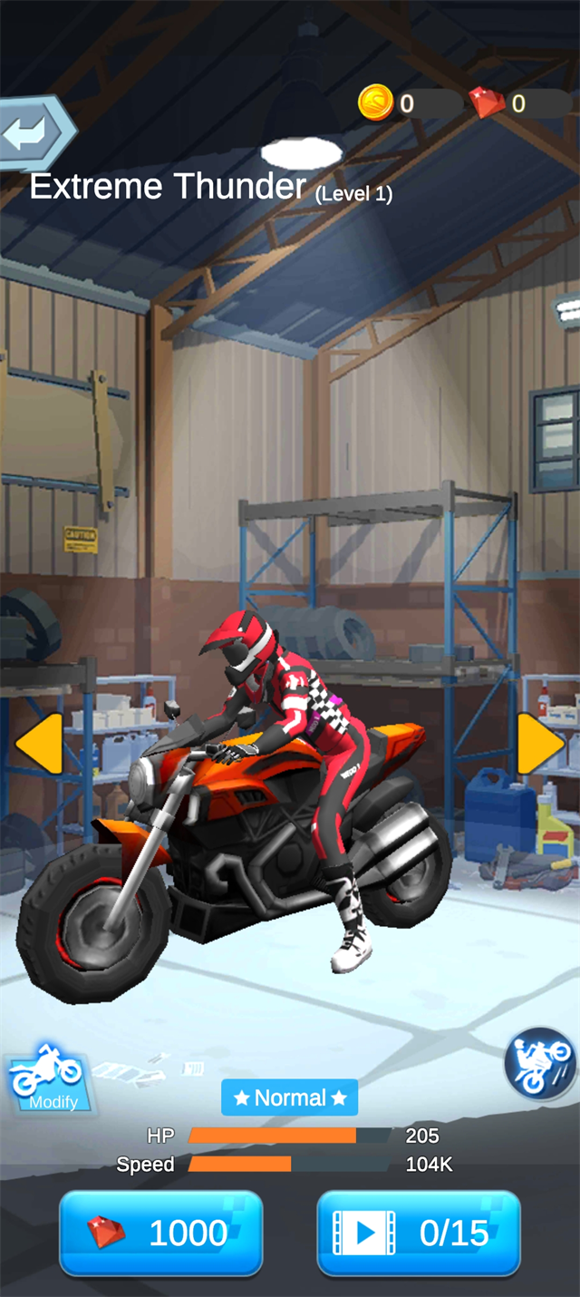 2、通过左右滑动屏幕控制摩托车方向。当金币或钻石积累到指定数量时,可点击下方按钮升级车辆性能或强化武器系统,为后续对抗做好准备。