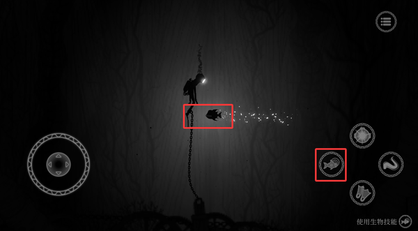 5、当使用触手能力控制小型鱼类后,引导其游至主角脚边,利用其“撕咬”特性咬断铁链,从而打开新的通路。