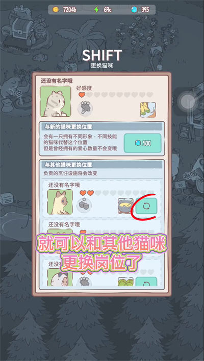 3. 点击红色框选区域内的交换图标,即可与其他猫咪互换工作岗位。