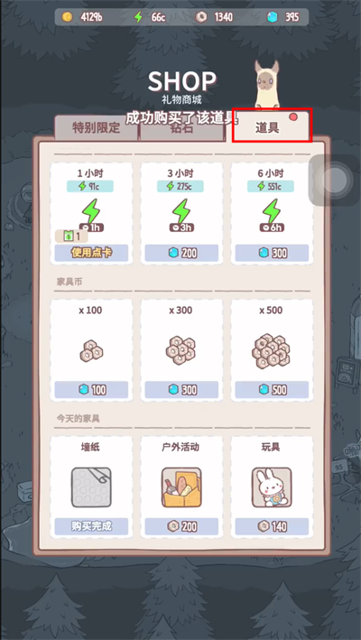 2. 进入后选择“道具”分类,滑动至底部即可购买各类家具。