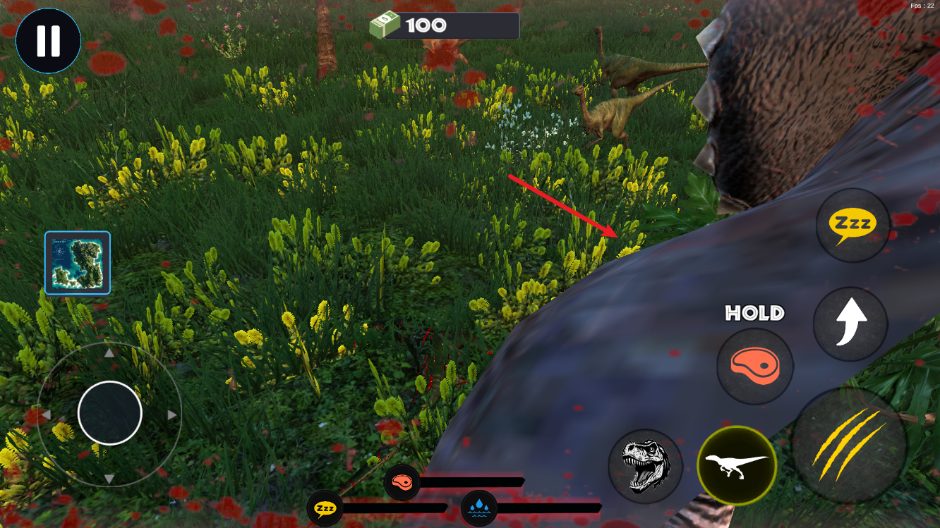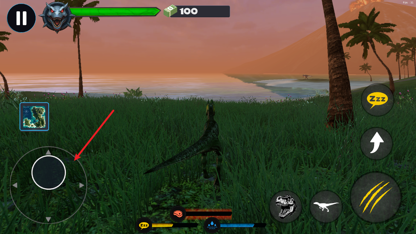 2、屏幕左侧虚拟摇杆控制移动方向,长按可实现持续移动,便于追击猎物或规避强敌。