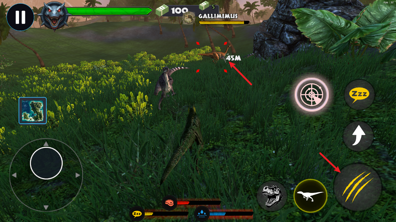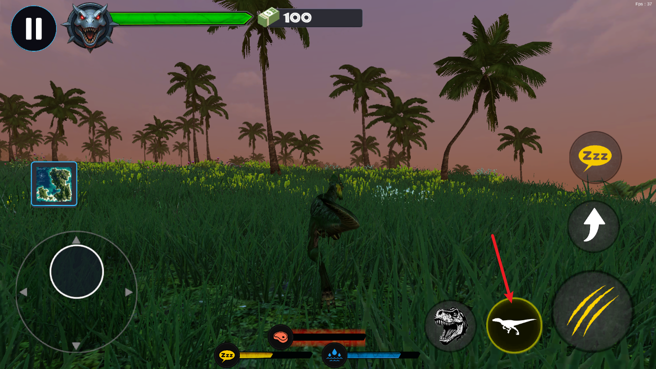 3、点击右侧“奔跑按钮”,恐龙进入加速状态,既可用于快速接近目标,也能在危急时刻迅速撤离。