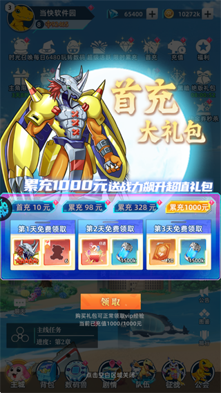 - 完成新手教程免费领取五星究极体——战斗暴龙兽,开局即享强力战力。