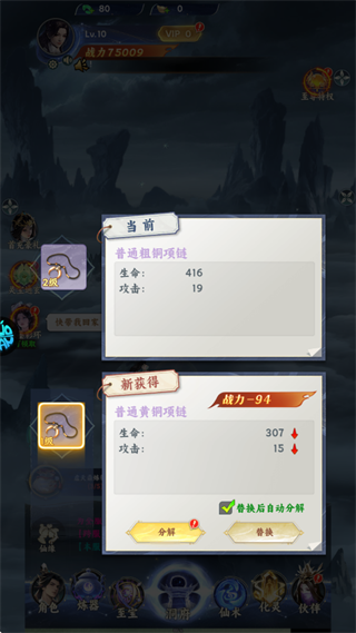 2、穿戴各部位装备以提升战力,替换下的旧装备将自动分解为升级材料。