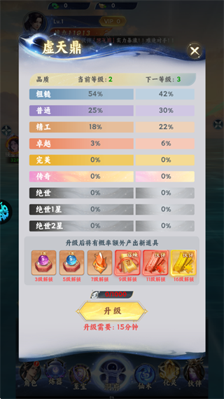 3、利用多余装备材料升级【虚天鼎】,可显著提高稀有装备的产出概率。