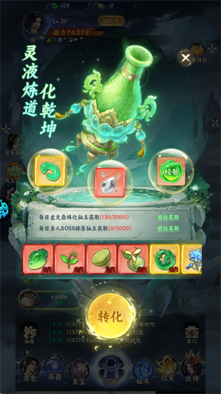 4、在界面左侧使用【灵液转化】功能,将各类材料高效转化为通用货币“灵玉”。