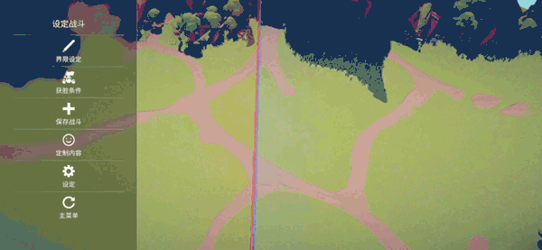 在全面憨憨战争模拟器手机版中,玩家不仅可通过主菜单的【定制内容】进入编辑器,还能在沙盒模式的排兵布阵界面,点击左上角设置按钮,快速调出战斗设置与定制功能: