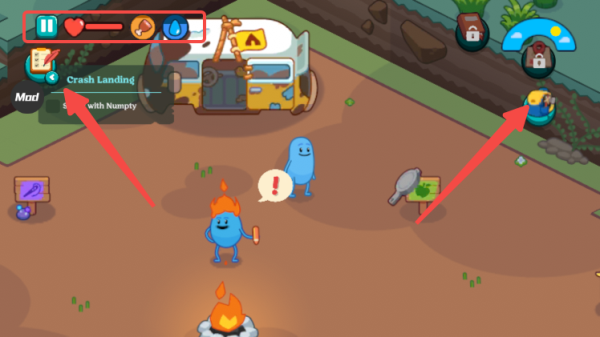4. 根据左侧任务提示推进剧情,右侧背包用于存取物品,屏幕上方会实时显示游戏内时间变化,同时需密切关注角色的生命值、饱腹度等关键状态。
