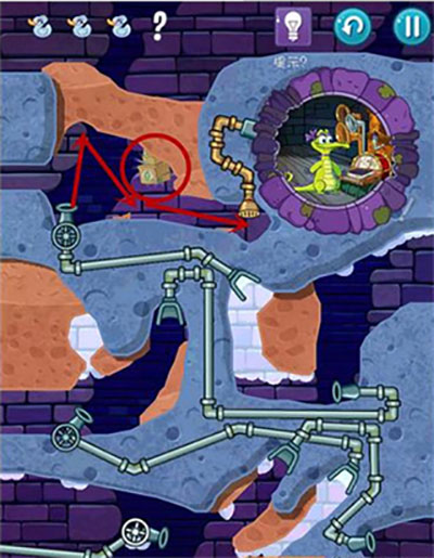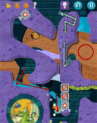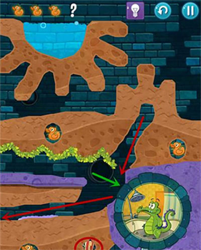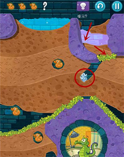 - 首先,在通往上方鸭子的路径上挖掘通道,并打开红色水闸开关。此时泥浆接触青草会转化为石头;