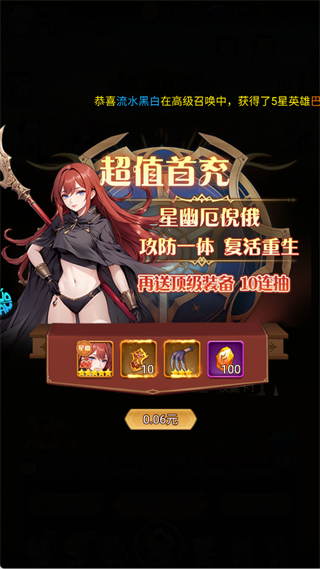 仅需0.06元即可获得攻防兼备、自带复活能力的5星英雄「星幽厄倪俄」,同时附赠顶级装备与10连抽资源,是性价比极高的开局选择。