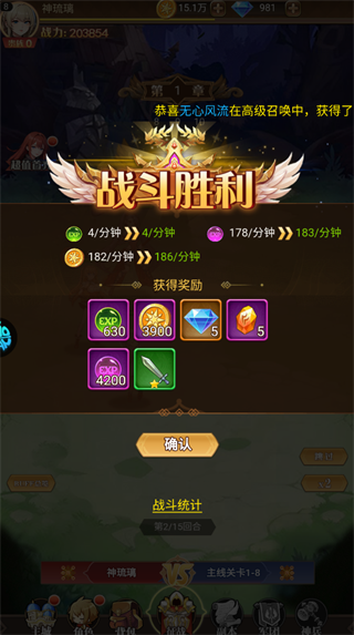 每通关一关均可领取EXP、金币、钻石及养成素材,同时提升挂机收益效率,构建离线成长正循环。