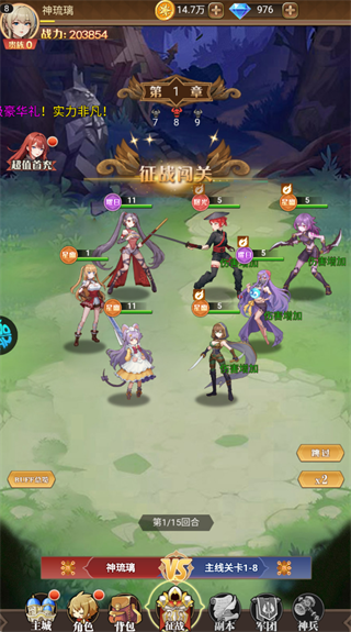 「征战闯关」作为核心剧情玩法,采用回合制自动战斗模式,合理搭配阵营可激活额外BUFF,是前期获取经验、金币与养成材料的主要来源。