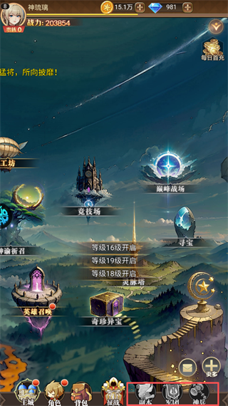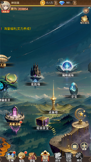 主界面集成竞技场、巅峰战场、寻宝、灵脉塔、英雄召唤等全部功能模块,是日常活动参与与资源获取的总枢纽。