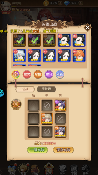 支持按「曙光 / 星幽 / 曜日 / 永夜」四大阵营筛选英雄,在3×3的前、中、后排站位中灵活配置阵容,亦可一键布阵快速应对不同战斗场景。