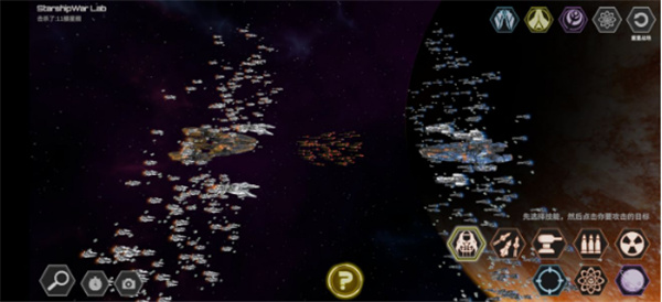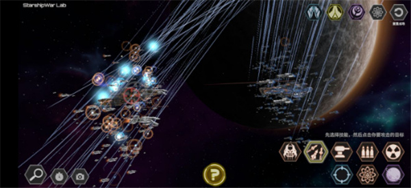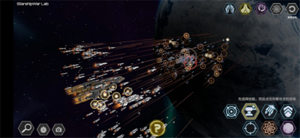 5. 使用技能时,先点击目标技能图标,再点击敌方舰队中的具体舰船即可发动攻击,所选舰船即为攻击对象;