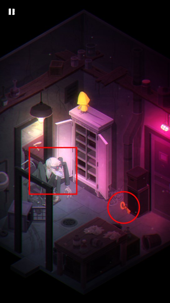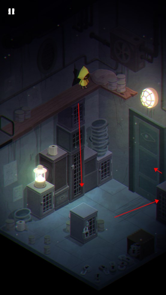 2. 打开柜子另一侧的门,爬上顶部将装有钥匙的罐子推落摔碎,拾取钥匙;注意怪物出现时需等待其离开后再行动。
