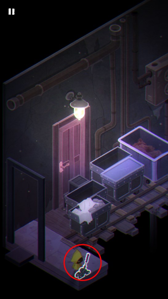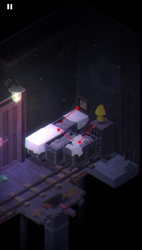 4. 返回取钥匙的房间,打开门进入下一场景;拉动右侧开关使小车启动,待其行至轨道尽头后再次拉起开关复位。
