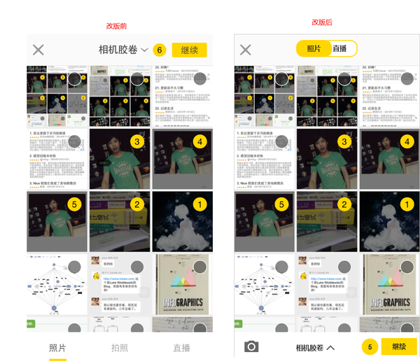 1.选择照片:【点击】相机胶卷约有0.5秒延迟;直播入口放的太深了;相册展示是下拉展示以往照片,而苹果自带的相册是上拉展示以往照片,一开始用户会不习惯