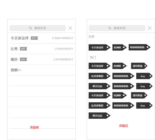 有目标:直接输入;历史标签;搜索;没有目标:热门标签;搜索
