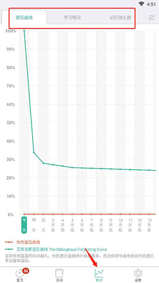 7、各位在统计中可以看到遗忘曲线、学习情况、记忆持久度等来掌握你的学习情况;