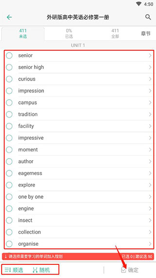 可以顺选,可以随机,选择完毕点击“确定”,就能进入到学习界面了;