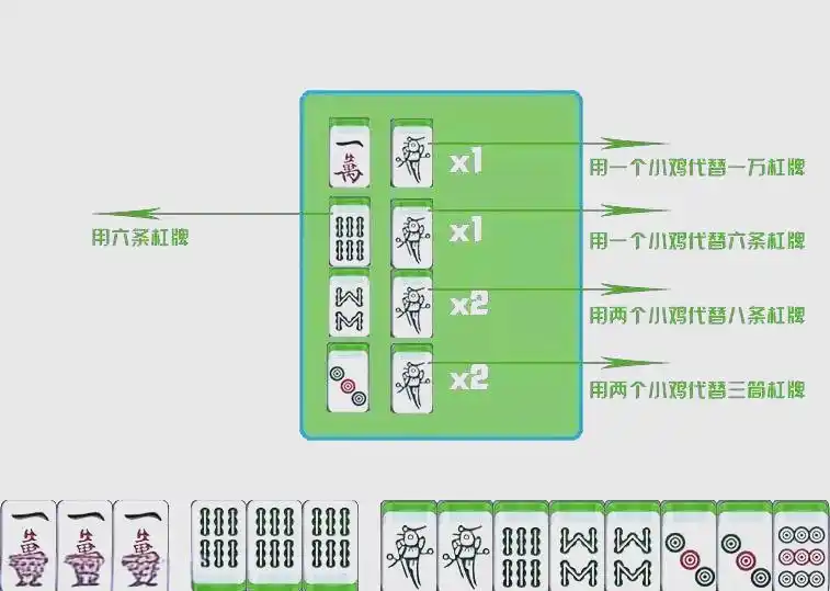 小鸡被视为通用牌,可以与任意牌组合使用。小鸡能替代任意牌,但需在特定组合下。例如,杠牌时,若以小鸡参与组合,一个小鸡可与一个刻子组合杠,两只小鸡需配一个对子,而三个小鸡则可与任意一张牌组合杠。