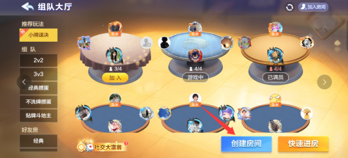 3、选择"三人对战"玩法并确认规则,即可成功创建专属游戏房间(具体步骤如图所示)。