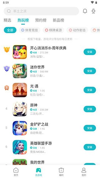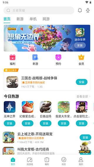 我们可以在首页看到今日推选、今日热游,还有福利、新游、预约、会员,满足不同需求。