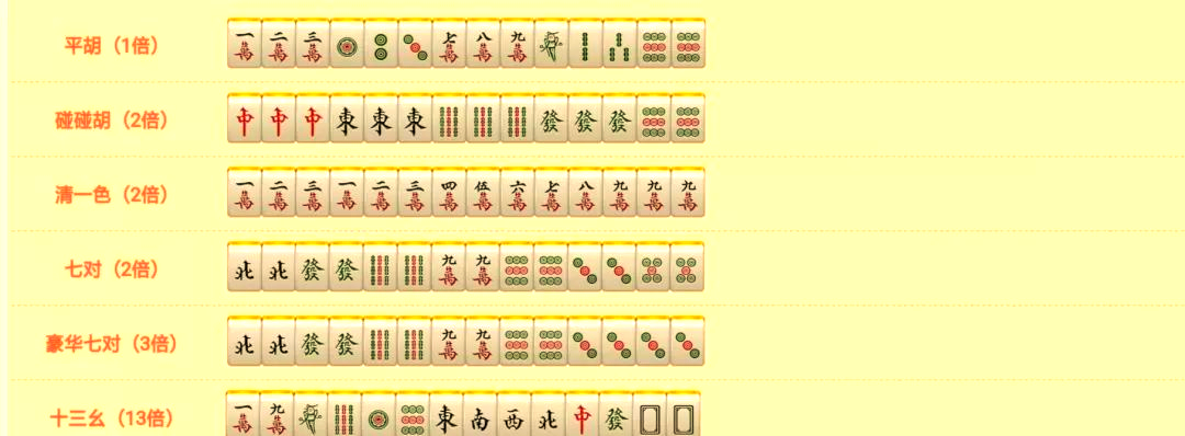①平胡:基础分值为1倍。②碰碰胡:基础分值为2倍。③清一色:基础分值为2倍。④七对:基础分值为2倍。⑤豪华七对:基础分值为3倍。⑥十三幺:基础分值高达13倍。