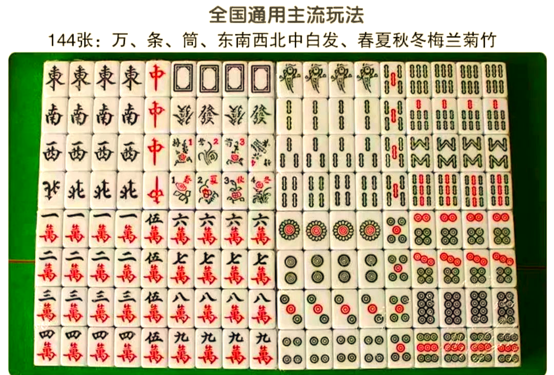 海南麻将的牌数共计144张,其中包括万、饼(或称筒子)、条(或称索子)三种基础牌型,数量为108张。此外,还有风牌、箭牌等特殊牌型,以及8张花牌,为游戏增添了丰富多样的玩法。