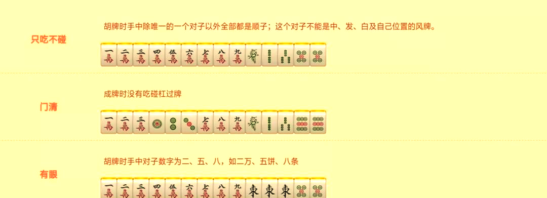 ①只吃不碰:指玩家在游戏中只吃牌而不碰牌,达到特定条件时可以触发某种番型。