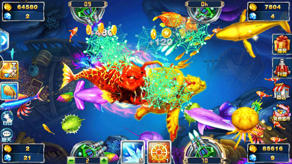 在遇到炮台的附近游过的慢鱼,比如说灯笼鱼、魔鬼鱼、乌龟……,这些鱼基本上通通来白白给你送分来的,只需要把炮口方向与等级调好,再不停的打就能全部收入囊中了。