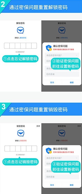 如果已经登录,可通过【我的—>设置—>安全—>解锁密码】路径进入相应页面。点击【忘记解锁密码】后同样需要完成密保问题验证才能重设密码。销毁密码的重置流程与此类似。