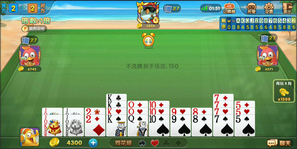 在此局游戏中,利用两手同花顺搭配小顺和对牌,配合大小王,形成完整出牌体系,先手优势明显。