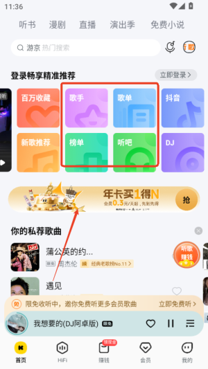 4、通过分类入口选择民谣、流行、摇滚等风格,快速找到合口味的音乐。